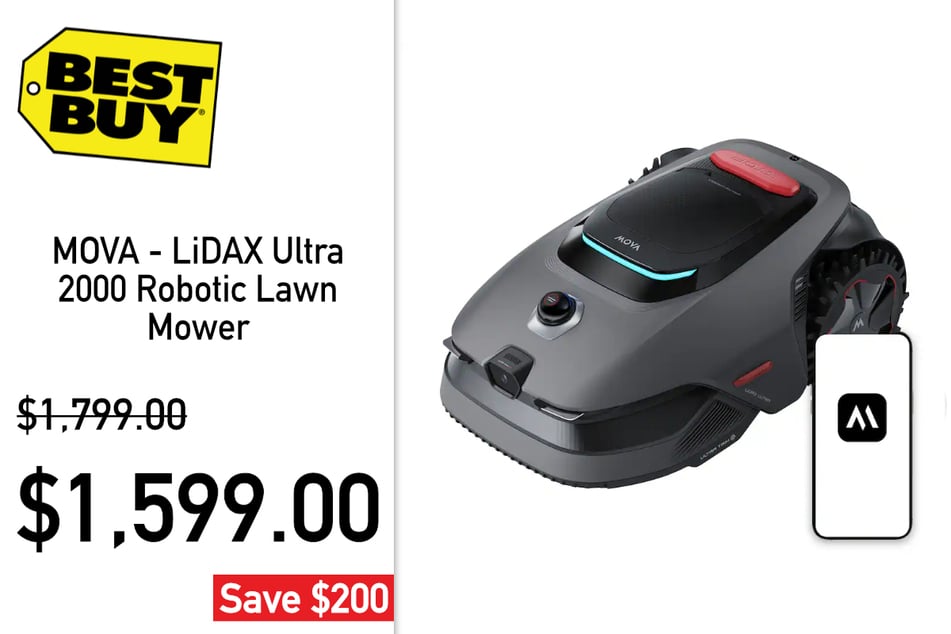 At the top of the list is the MOVA LiDAX Ultra 2000 Robotic Lawn Mower at $1,599, down from $1,799.