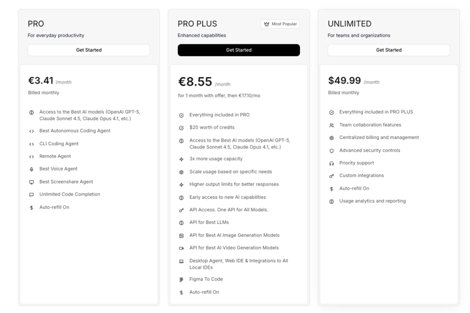 For developers seeking enhanced capabilities, Pro Plus stands as the most popular choice at $8.55 for the first month, then $19.99 monthly thereafter.
