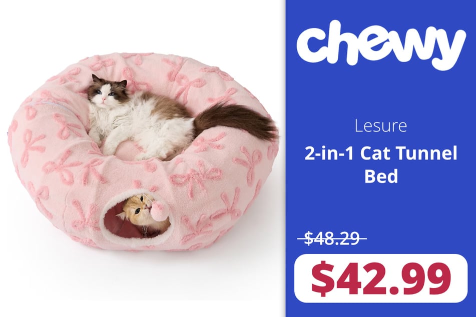 For only $42.99 instead of $48.29 get this super cute 2-in-1 Cat Tunnel Bed in Pink with Bows. It combines playtime fun and cozy napping, so your cat stays happy and active.