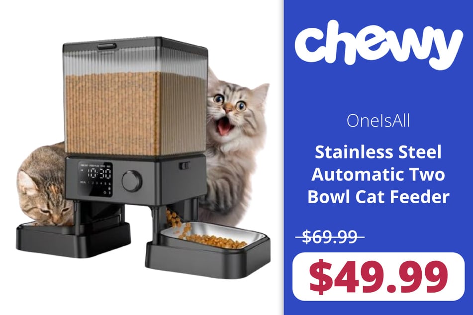 You'll appreciate the easy-to-use dial for programming and feeding control of the OneIsAll Stainless Steel Automatic Two Bowl Cat Feeder for $49.99 instead of $69.99.