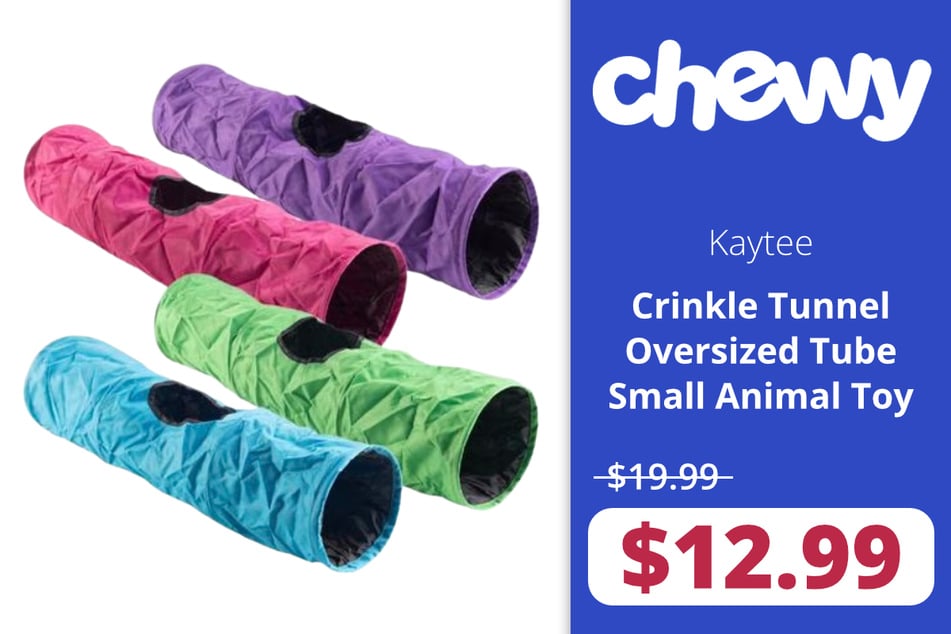 The Kaytee Crinkle Tunnel Oversized Tube Small Animal Toy for $12.99 instead of $19.99 is an expandable tunnel stretching 23-inches long, with crinkle material between the fabric.