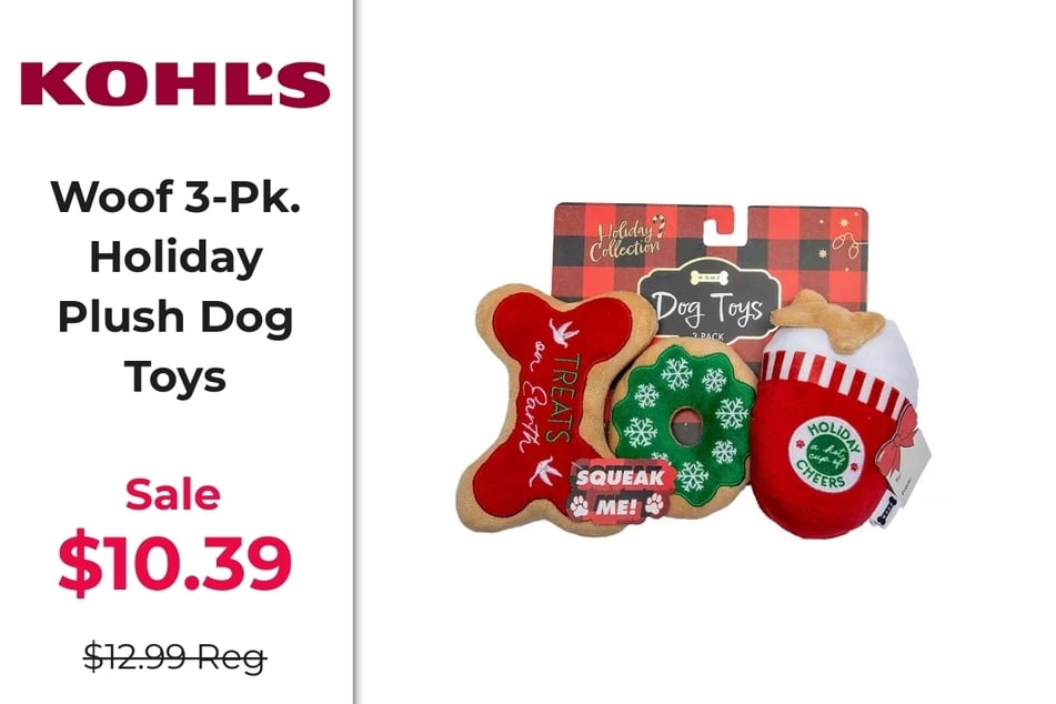Pet owners can also celebrate with the Woof 3-Pk. Holiday Plush Dog Toys, reduced from $12.99 to only $10.39, giving your four-legged companions festive fun at a fraction of the cost.
