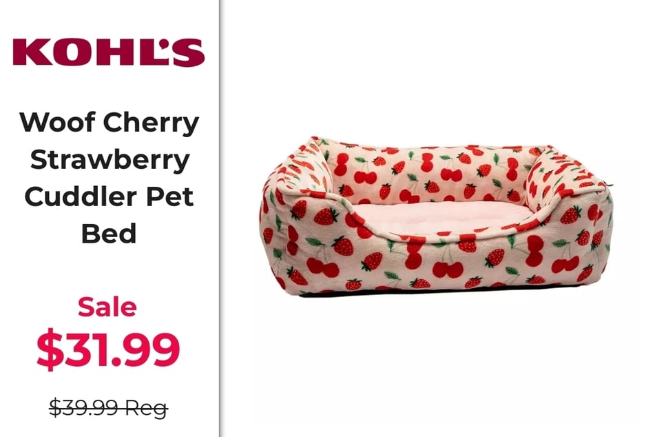 A standout pick: the Woof Cherry Strawberry Cuddler Pet Bed, now just $31.99, down from $39.99.