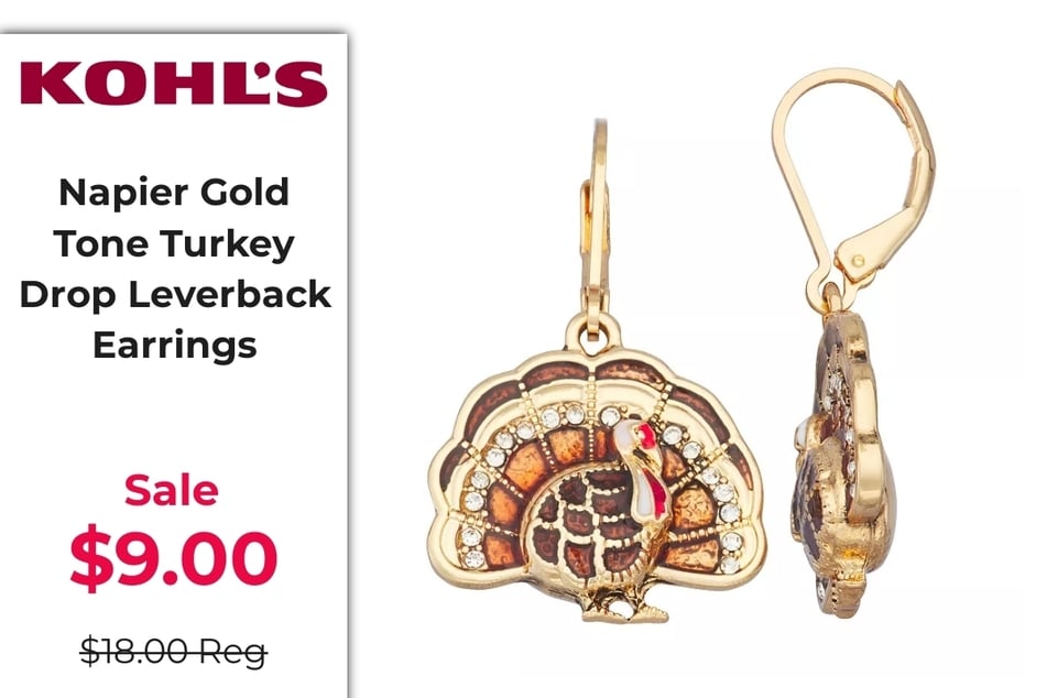 Need a conversation-starter gift? The Napier Gold Tone Turkey Drop Leverback Earrings are now $9.00, cut from $18.00.
