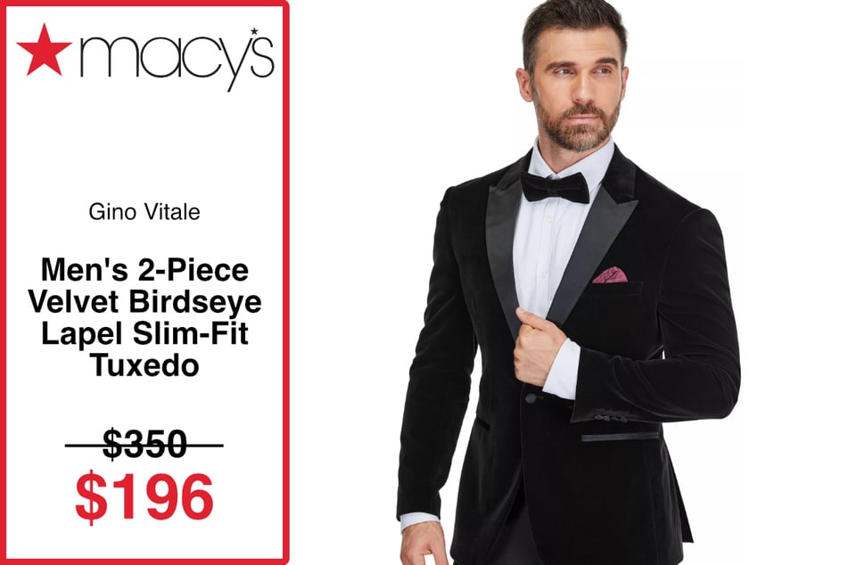 This piece is the perfect choice for elegant celebrations and a stylish New Year's Eve: the Gino Vitale Men's 2-Piece Velvet Birdseye Lapel Slim-Fit Tuxedo for $196 instead of $350.