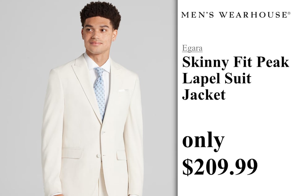 At the top of the list is the Egara Skinny Fit Peak Lapel Suit Jacket for just $209.99.