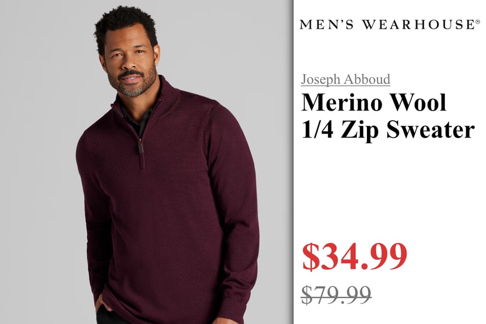A quarter zip sweater has become men's go-to layering piece for a reason this year, and the Joseph Abboud Merino Wool 1/4 Zip Sweater at $34.99, down from $69.99, is a perfect example of why.