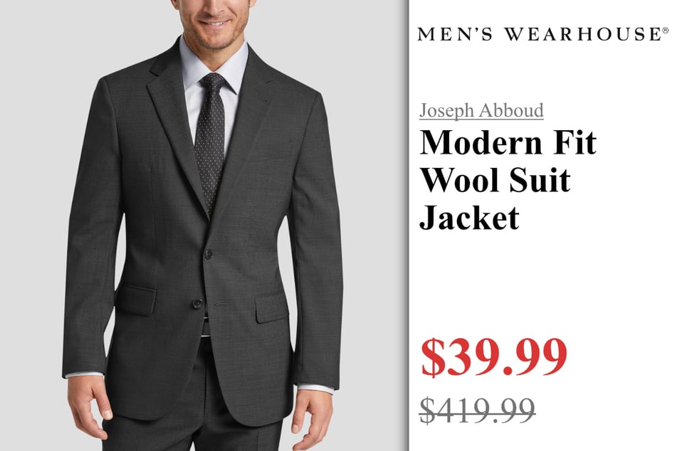 Take one of our favorites: The Joseph Abboud Modern Fit Wool Suit Jacket, now just $39.99, down from $419.99.