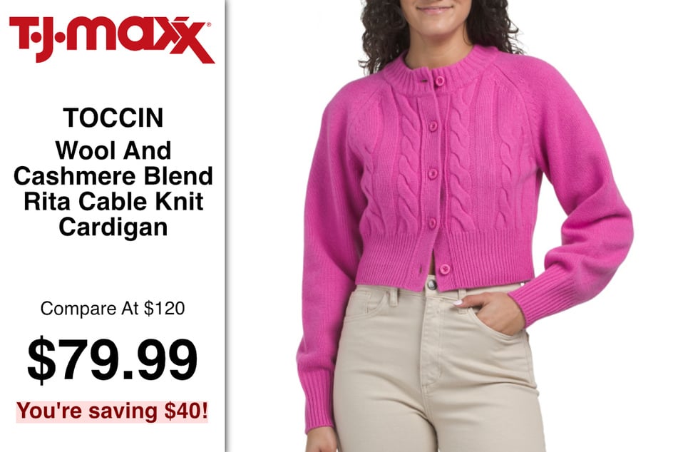 T.J.Maxx really delivered: Available in a gorgeous color, the TOCCIN Wool And Cashmere Blend Rita Cable Knit Cardigan is just $79.99 – nearly $40 below its $120 retail price.