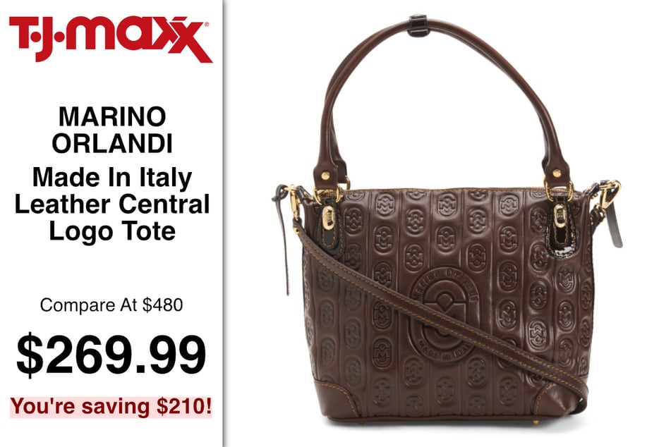 The MARINO ORLANDI Made In Italy Leather Central Logo Tote at $269.99, down from $480, features dual carry handles, a detachable shoulder strap and gold tone hardware.